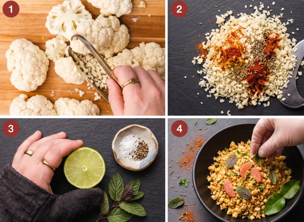 - Chop cauliflower into small pieces resembling rice, or pulse in a food processor until it looks like rice….