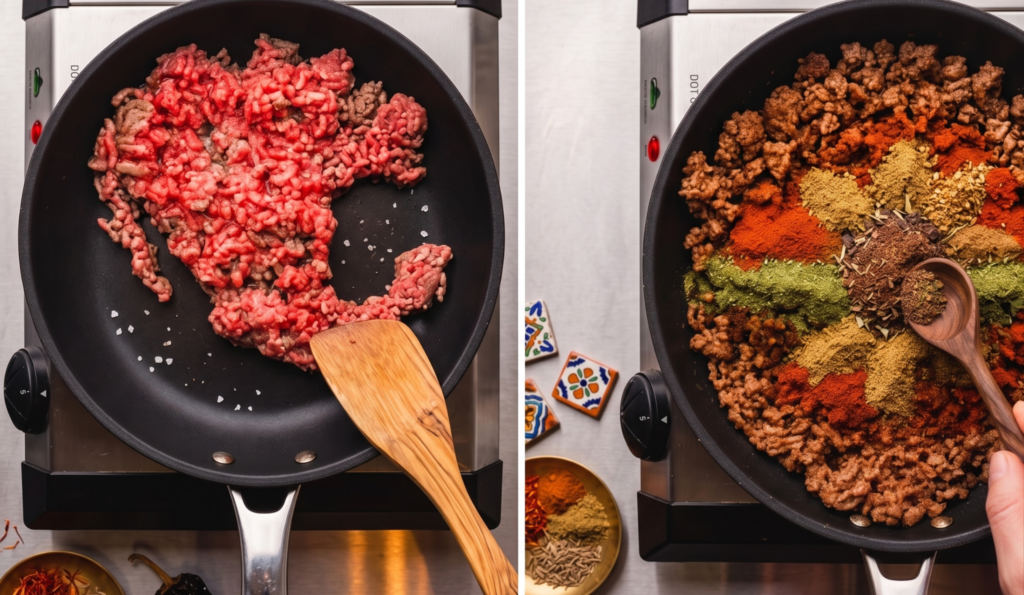 - Brown ground beef over medium-high heat.